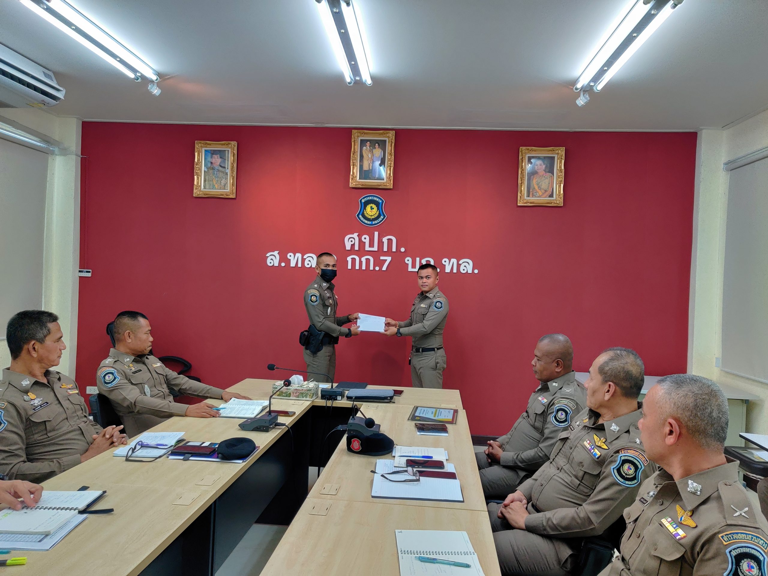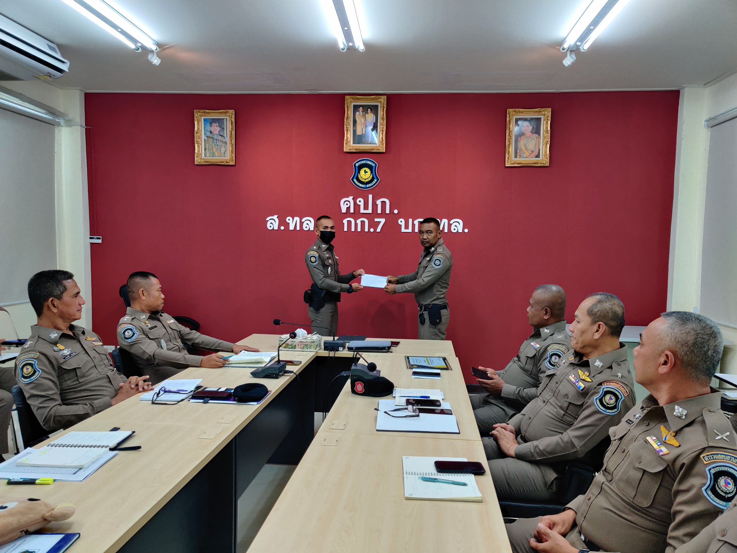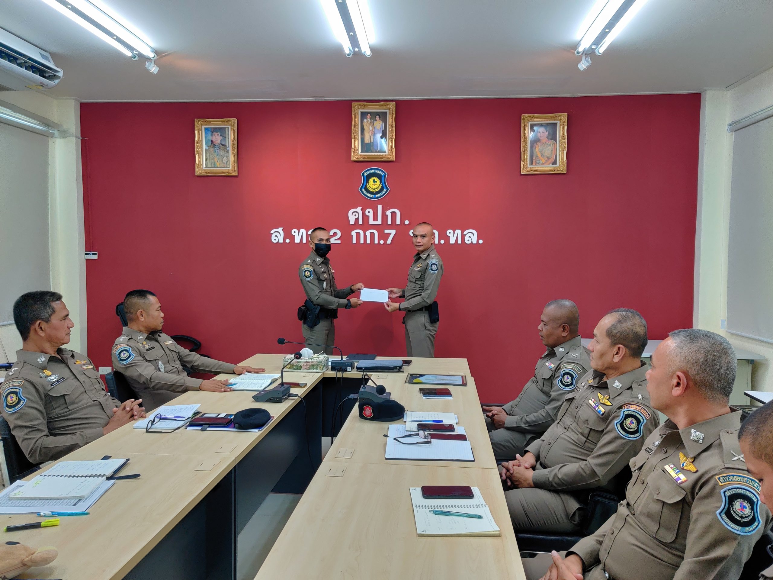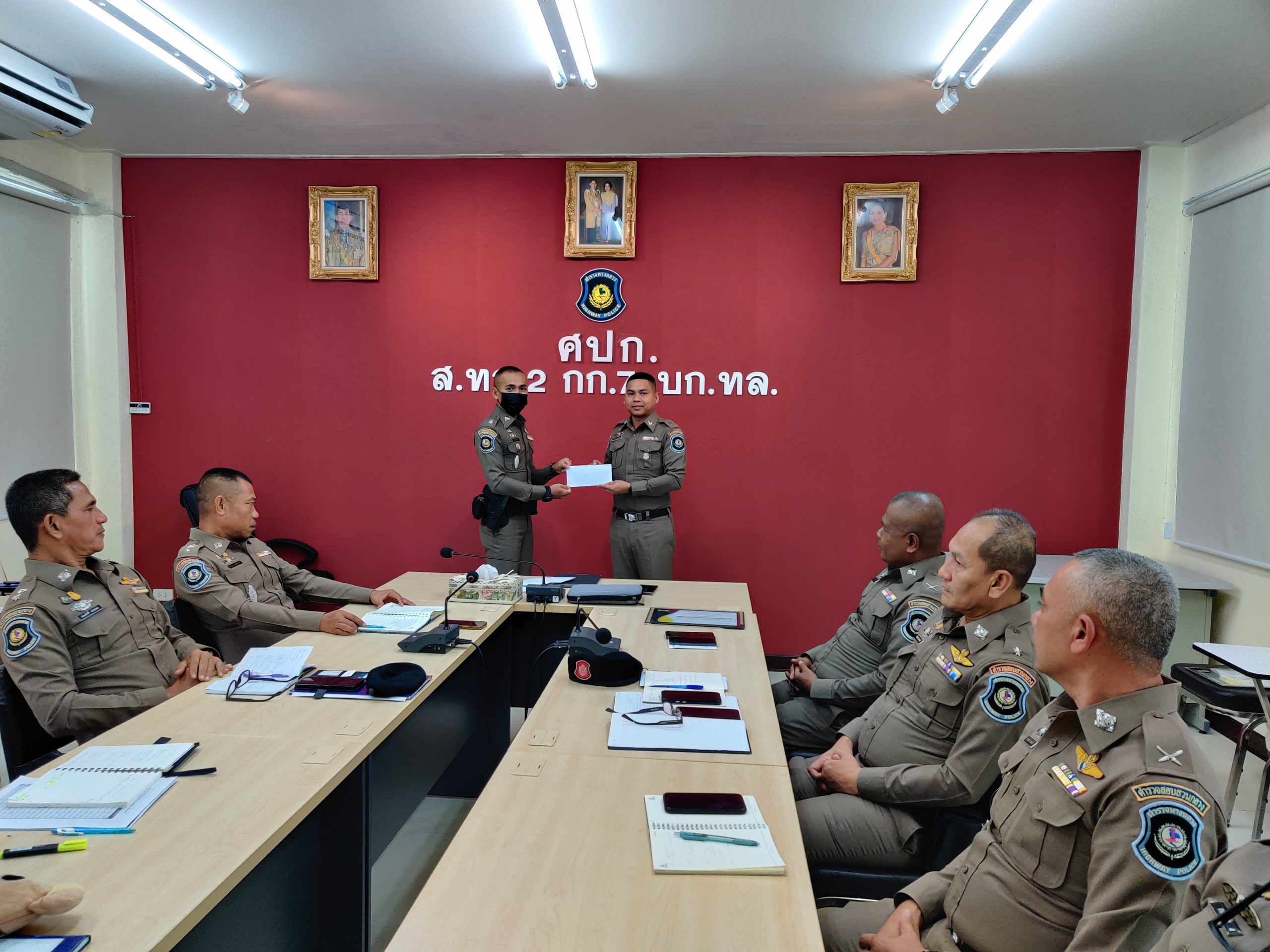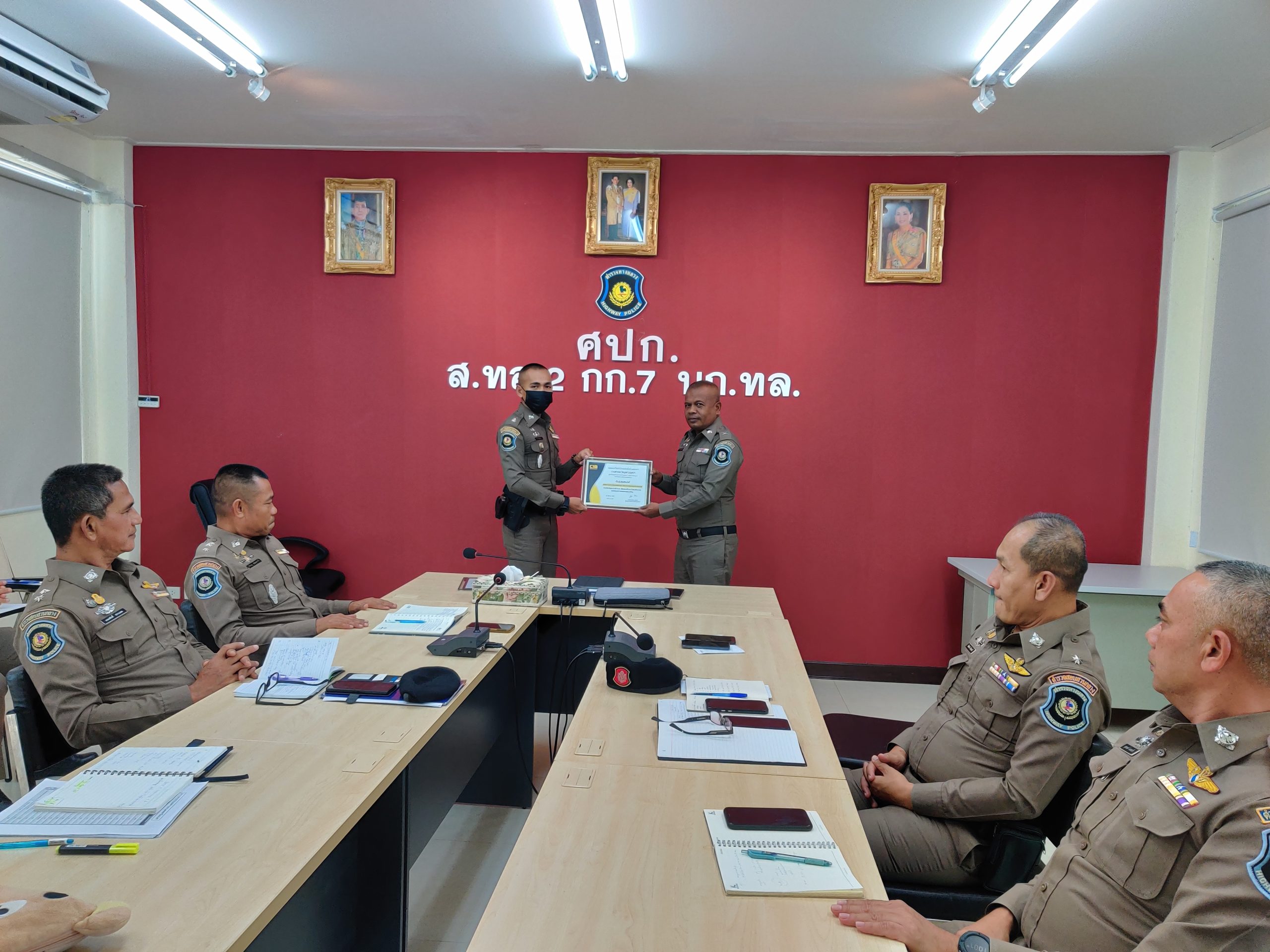 พ.ต.ต.วิชัย โมฆรัตน์ สว.ส.ทล.2 กก.7 บก.ทล. ประชุมข้าราชการตำรวจในสังกัด เพื่อมอบนโยบายประจำเดือนพร้อมทั้งมอบรางวัลผลการปฏิบัติงานดีเด่น เพื่อเป็นขวัญและกำลังในการปฏิบัติงาน