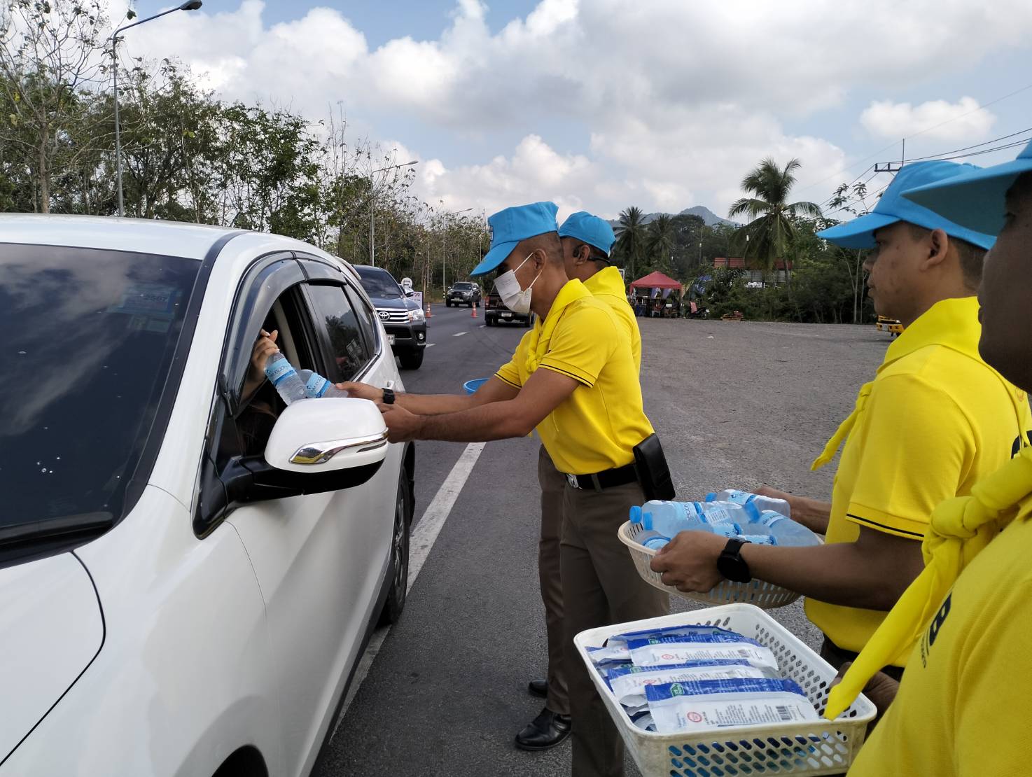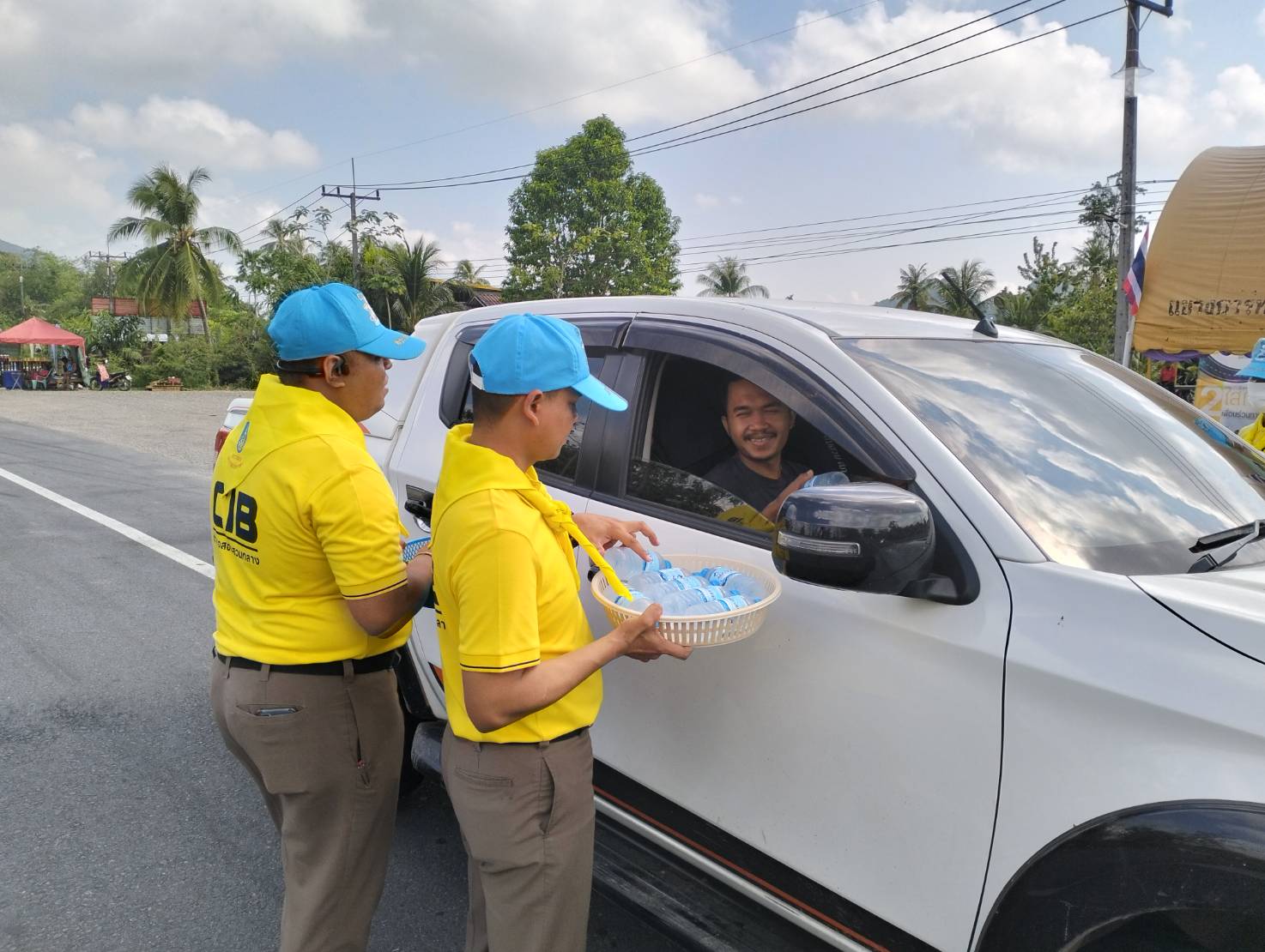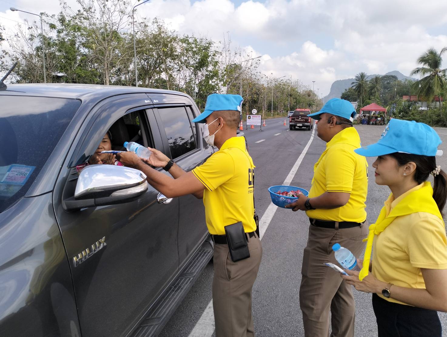 พ.ต.ต.วิชัย โมฆรัตน์ สว.ส.ทล.2 กก.7 บก.ทล.พร้อมเจ้าหน้าที่ตำรวจทางหลวงร่วมกันทำจิตอาสา ด้วยการแจกเครื่องดื่มให้กับประชาชนที่เดินทางในช่วงเทศกาลสงกรานต์ 2567 บริเวณหน้าหน่วยบริการประชาชนตำรวจทางหลวงพัทลุง